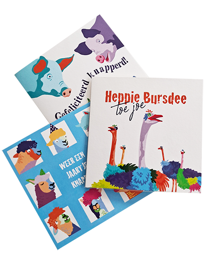 Alle kaarten zitten in een doorzichtig portefeuillezakje en voor elke kaart wordt een enveloppe meegeleverd. Voor de wenskaarten is mooi en stevig papier gebruikt, FSC gecertificeerd. Mijn kaarten brengen gegarandeerd een glimlach op het gezicht van de ontvanger! Maar kunnen ook ontroering teweeg brengen. De combi-natie van vrolijke illustraties en doordachte ontwerpen maakt elke kaart uniek en waardevol.